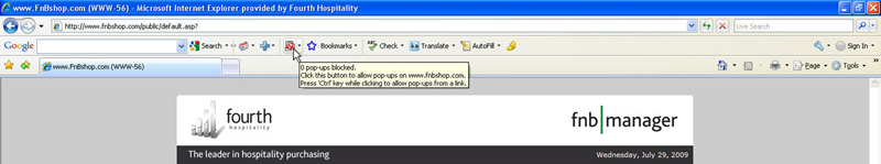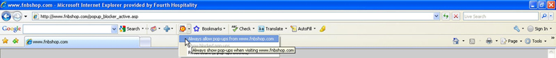 To permanently allow pop-ups for a specific website you must first visit it, your fnb manager portal (www.fnbshop.com/YOUR_COMPANY_NAME) in this case. Then look for the icon in the Toolbar and click the drop-down arrow beside it. Finally, select "Always allow pop-ups from www.fnbshop.com".