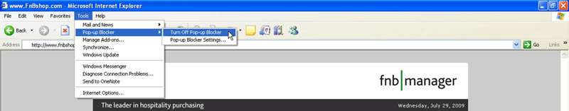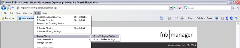 As an alternative, try holding down the CTRL key when clicking the Login button in fnb manager. This action will override the majority of pop-up blockers. For more specific information, please choose the appropriate item from the following list;