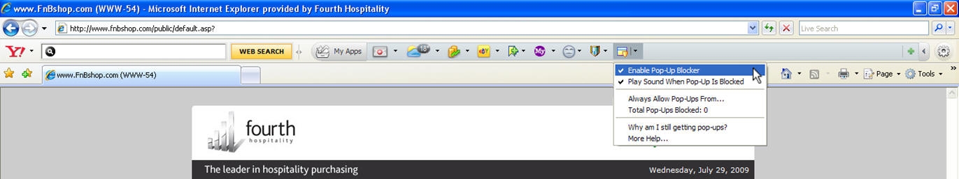 The pop-up blocker in the Yahoo! Toolbar is turned On by default. The last icon on the right in the "My Apps" bar indicates whether the Pop-Up Blocker is turned On( ) or Off ( ) - simply click the icon to switch between states.